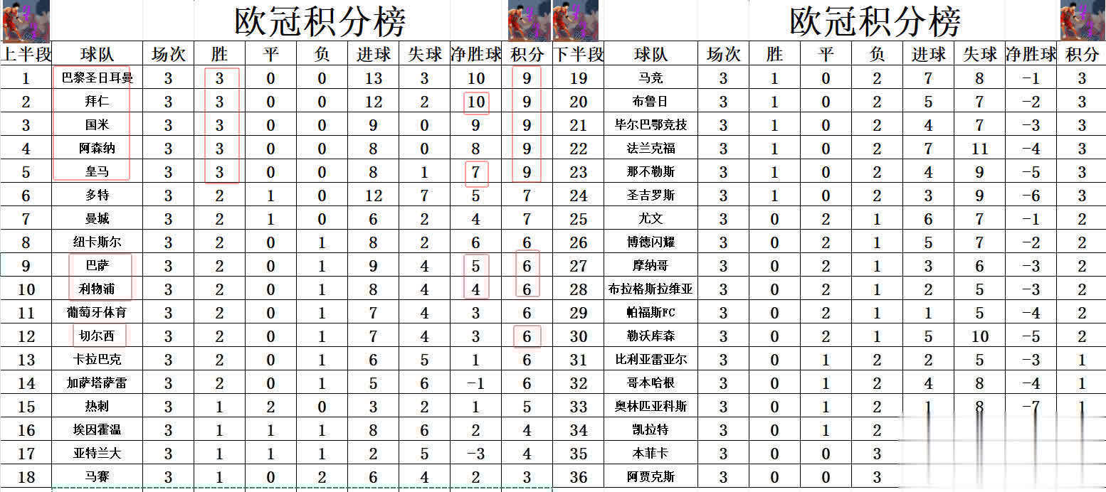 积分榜方面,今天皇马小胜,拜仁大捷,两队王人是追上了巴黎,国米和阿森纳,成为3轮事后保持全胜的5支球队,巴黎1个进球上风领跑,拜仁跳跃国米升至第2,皇马则是差阿森纳一个净胜球排在第5。利物浦在双线4连败后,今天终于是大捷止住颓势追上巴萨等队,利物浦1个净胜球的颓势排在巴萨之后位列第10,切尔西赢球后则是排在第12。